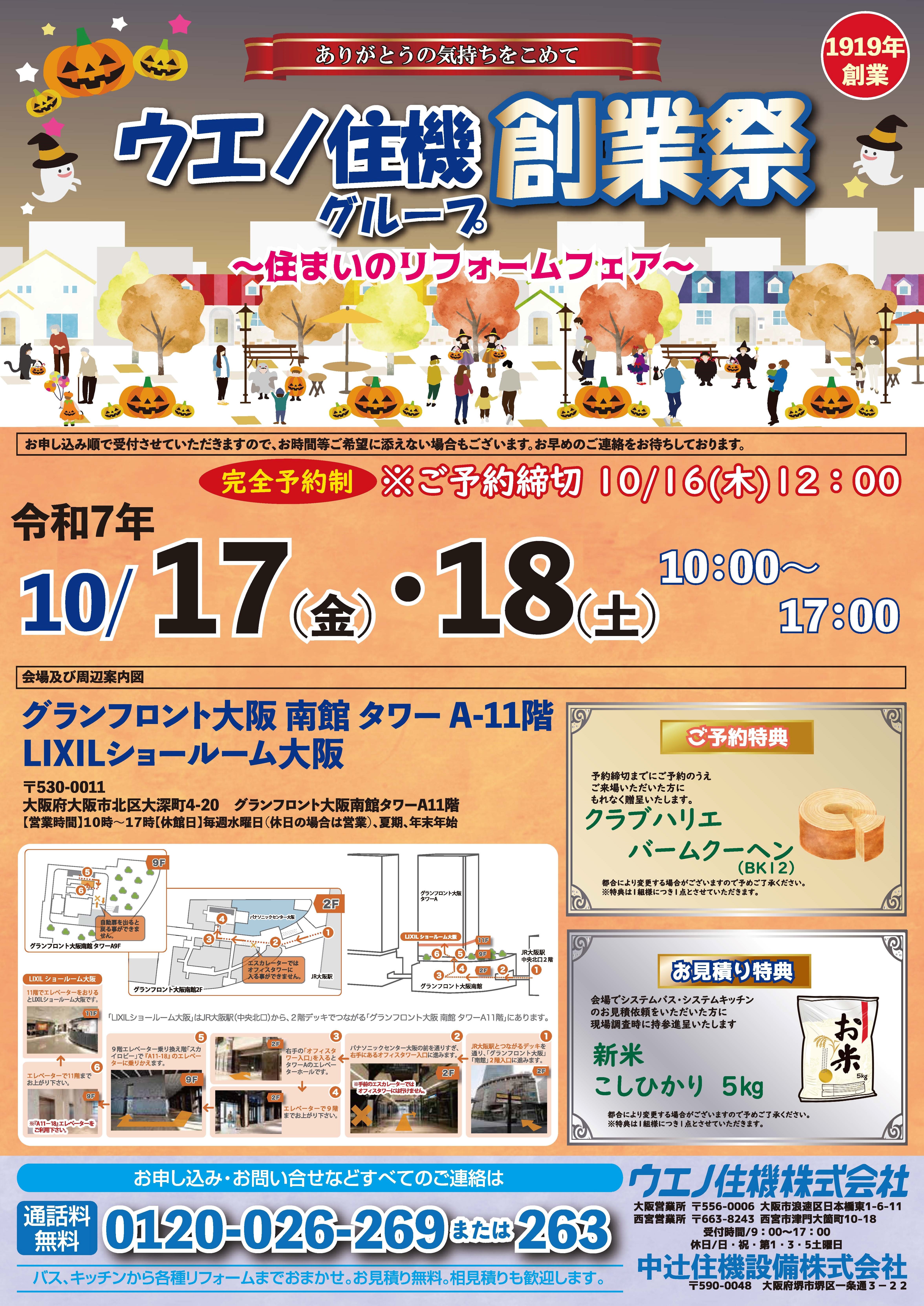 来る令和7年10月17日(金)・10月18日(土)、グランフロント大阪 南館 LIXILショールームにおいて「ウエノ住機創業祭~住まいのリフォームフェア~」を開催いたします。お客様にスムーズにご利用いただくため、事前予約にご協力をお願いいたします。ご予約は10月16日(木)12:00まで受け付けます。0120-026-263または0120-026-269までご連絡お願いいたします。お申し込みの順で受け付けさせていただきますので、お時間等ご希望に添えない場合もございます。お早めのご連絡をお待ちしております。