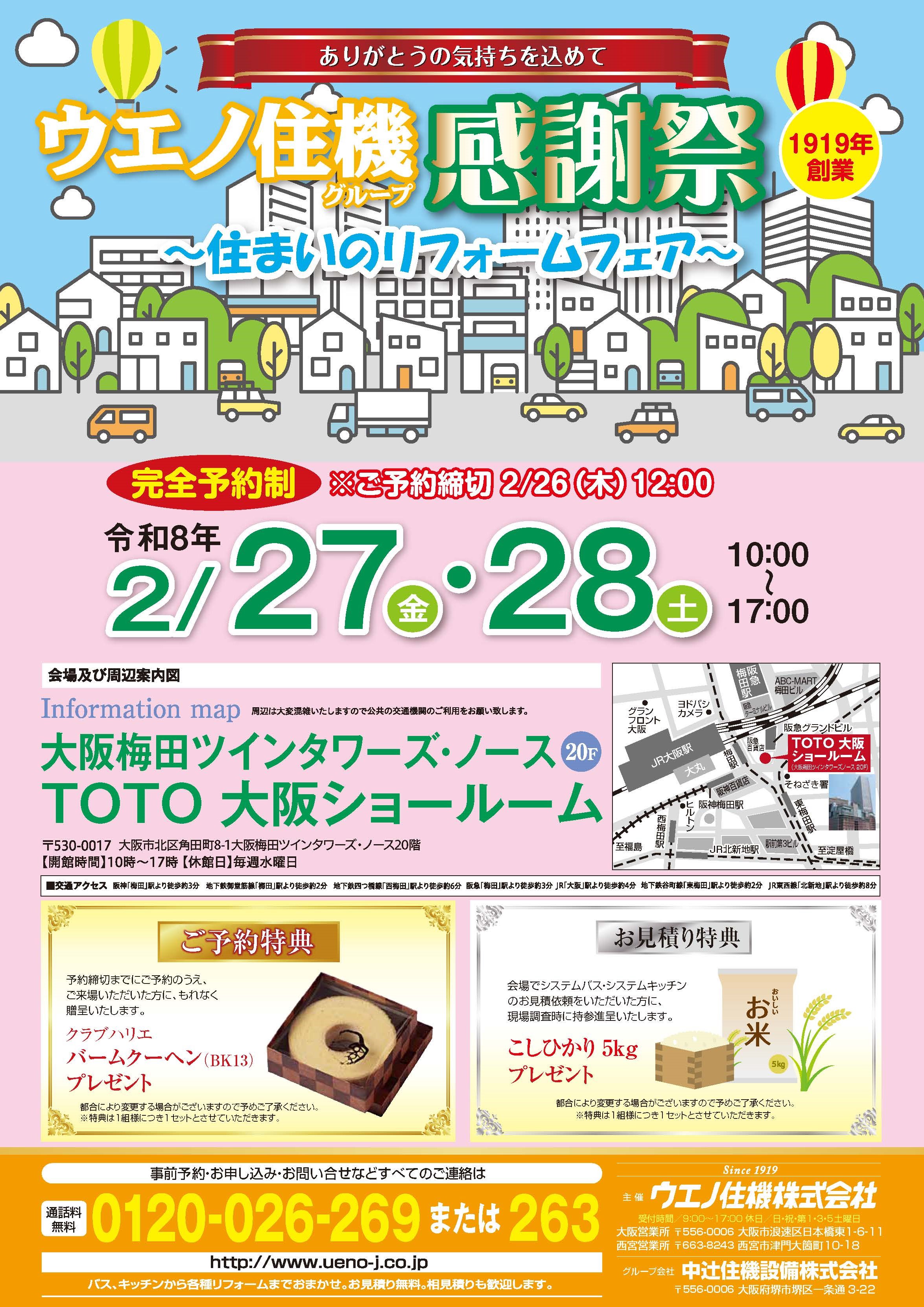 来る令和8年2月27日(金)・2月28日(土)、大阪梅田ツインタワーズ・ノース TOTO大阪ショールームにおいて「ウエノ住機感謝祭~住まいのリフォームフェア~」を開催いたします。お客様にスムーズにご利用いただくため、事前予約にご協力をお願いいたします。ご予約は2月26日(木)12:00まで受け付けます。0120-026-269または0120-026-263までご連絡お願いいたします。お申し込みの順で受け付けさせていただきますので、お時間等ご希望に添えない場合もございます。お早めのご連絡をお待ちしております。