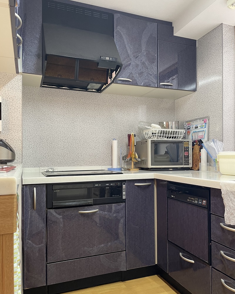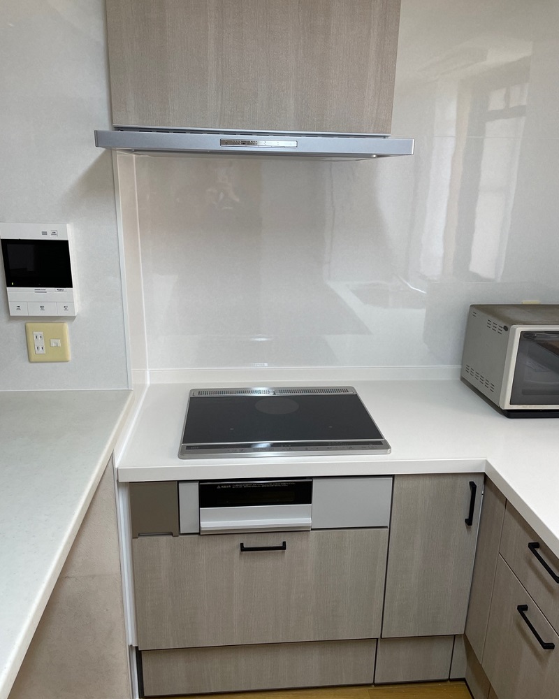 コンロ、レンジフードの不具合でお伺いした際、キッチン扉などにも経年劣化が見られたのでキッチンリフォームをお勧めしました。LIXILシエラSにお取替です。吊戸棚をなくしスッキリしたキッチン空間になりました。足元のケコミ部分にもたっぷり収納できるので、吊戸棚をなくしても収納スペースをしっかり確保できます。
