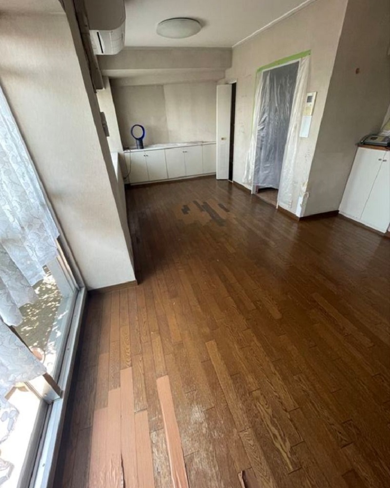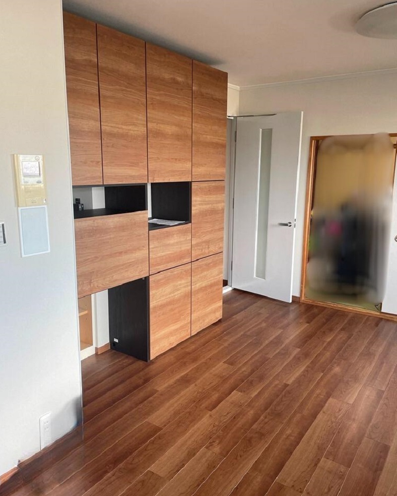 お孫様が誕生されたことがきっかけでリビングの内装工事をさせていただきました。床はパナソニックベリティスフロア(VKNS45CY)に貼替えました。収納は扉付きを希望され、パナソニックキュビオスを設置させていただきました。きれいに仕上り、お孫様を迎え入れられると大変喜んでいただきました。