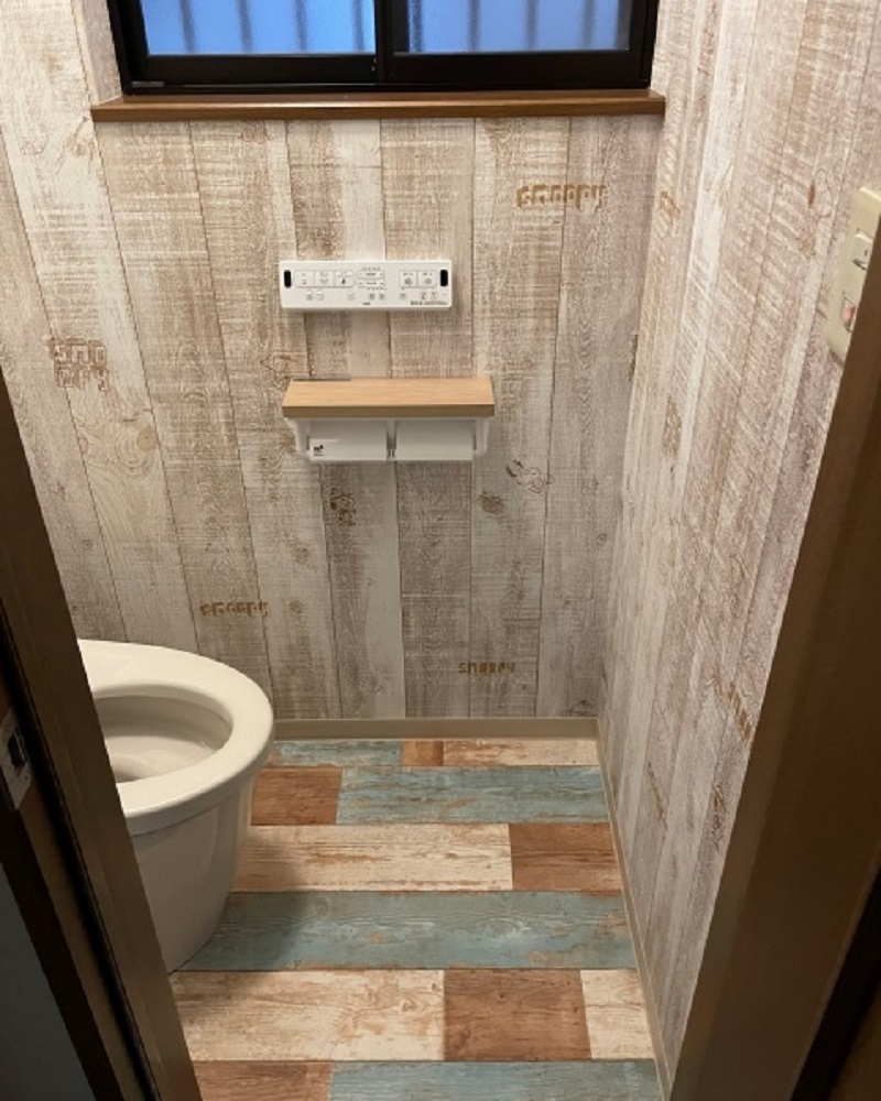 トイレリフォームさせていただきました。LIXILアメージュにお取替です。壁紙は木目にスヌーピーがスタンプされたようなデザイン(サンゲツFE76720)を選ばれました。ヴィンテージ感のあるおしゃれなトイレ空間に仕上がりました。