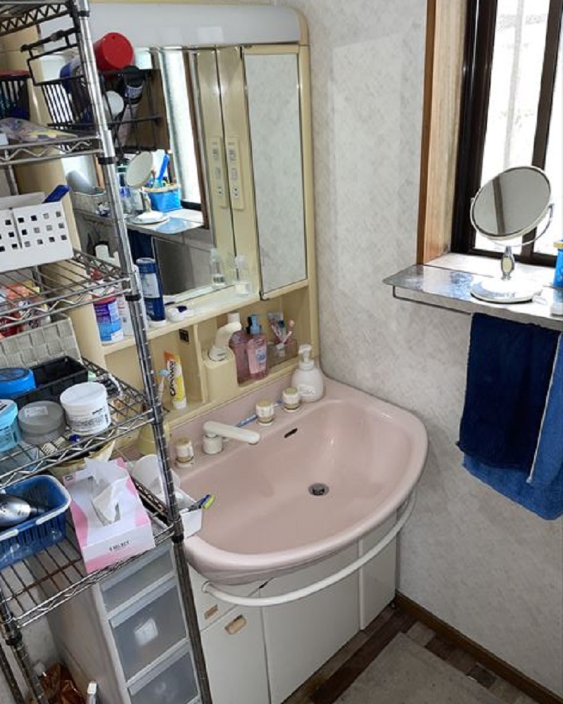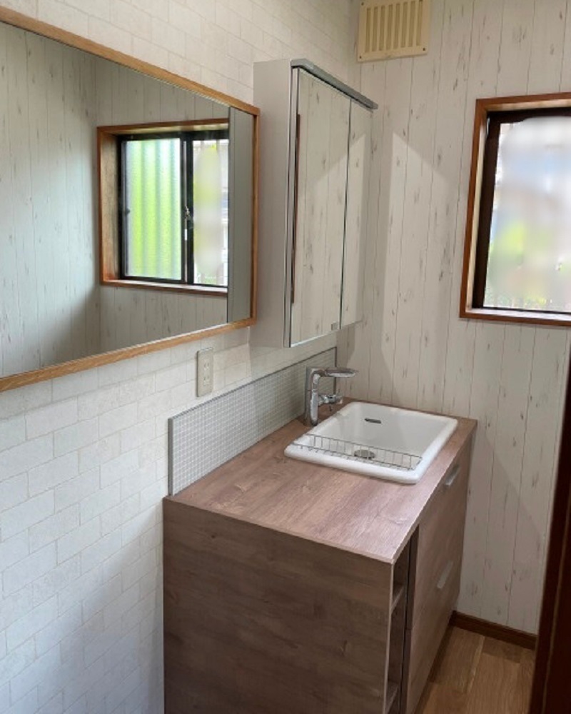 洗面所をリフォームしました。ショールームでTOTOドレーナを気に入られ、お取替しました。ウッド調のおしゃれなデザインですが、メラミン素材でできているので耐水性にも優れています。ボウルも大きく使い勝手抜群です。