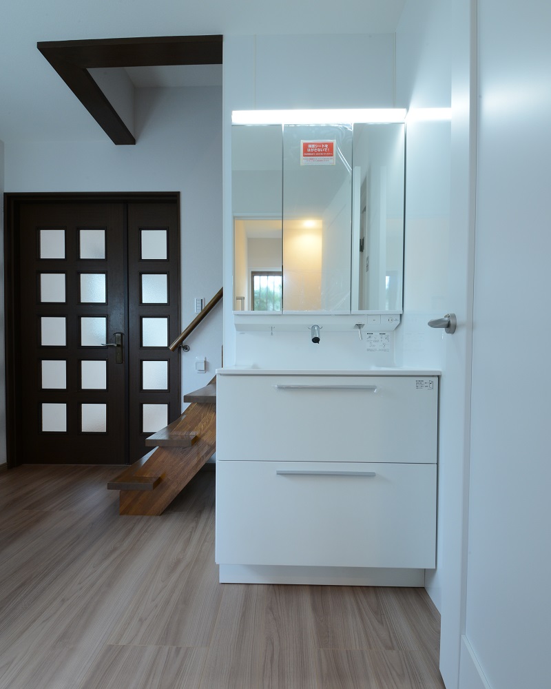 洗面化粧台をLIXILクレヴィにお取替しました。玄関ホールに洗面台を配置しました。玄関近くに洗面台があると、「帰宅後すぐに手洗いができて衛生的」「来客時にも使用気軽に使用してもらえいる」「玄関で身なりを整えられる」などのメリットがあります。