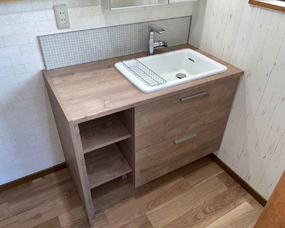 築20年のマンションで洗面化粧台をTOTOエスクアにお取替しました。エスクアは豊富な組み合わせで思い通りの洗面台にできることが特徴です。カウンター・洗面ボウル・扉カラー・水栓金具・キャビネットなどを自分好みにお選びいただけます。今回お客様が選ばれたカウンター・扉のカラーと壁紙がマッチしておしゃれな洗面化粧室に仕上がりました。